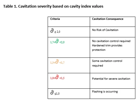 De ernst en uitbreiding van de cavitatie voor de kleppen op basis van caviteitsindexwaarden is weergegeven in tabel 1.